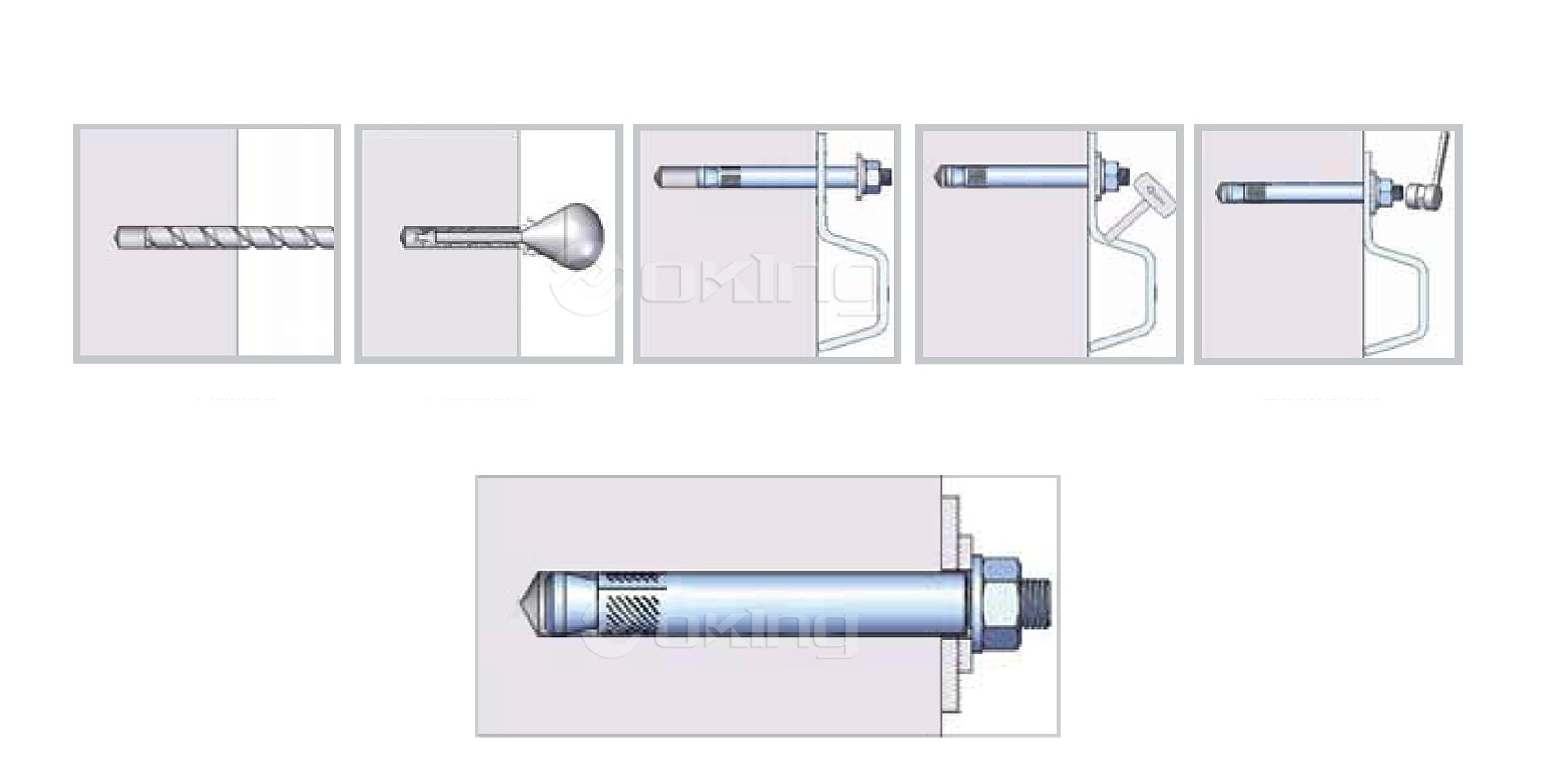 ●Tøm hullet for alt rusk, plasserer deretter kileankeret gjennom hullet i fiksturen eller direkte inn i betongen, og hamr det inn i det borede hullet, og sørg for at de er installert til ønsket dybde.