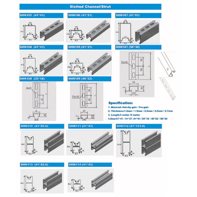 5. U-kanaler er tilgjengelige i forskjellige størrelser som 41*41,41*21 og tykkelse fra 1,5 til 3mm, dimensjoner og materialer som passer til forskjellige applikasjonskrav. Det spesifikke valget av u-kanal avhenger av belastningskapasitet, miljøforhold og den tiltenkte bruken.