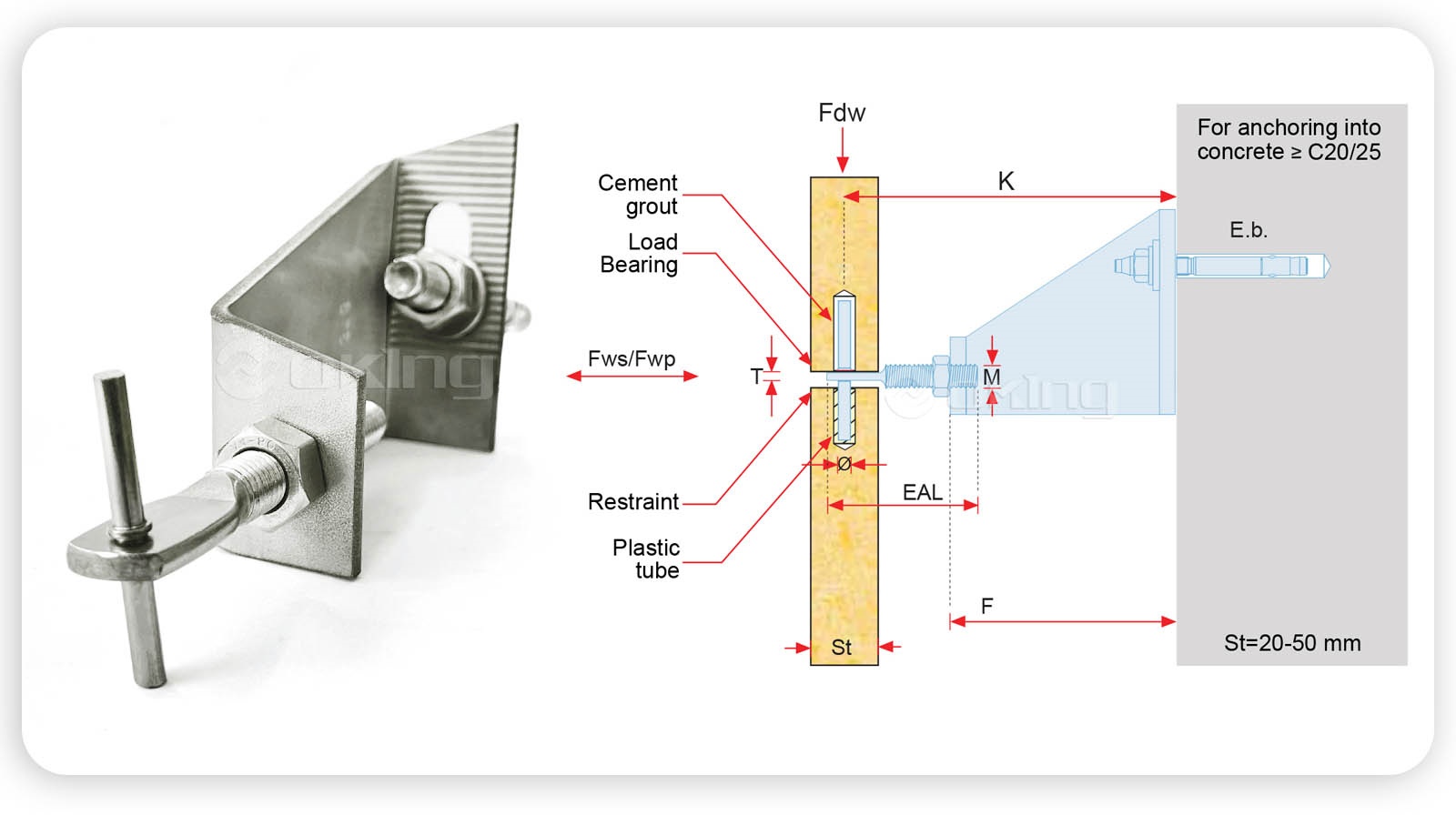 | K (mm) | K - (mm) | K (mm) | Fdw (N) | F (mm) | Fwp (N) | Fws (N) | E.b.(mm) | ф (mm) | M (mm) | T (mm) | EAL(mm) | |